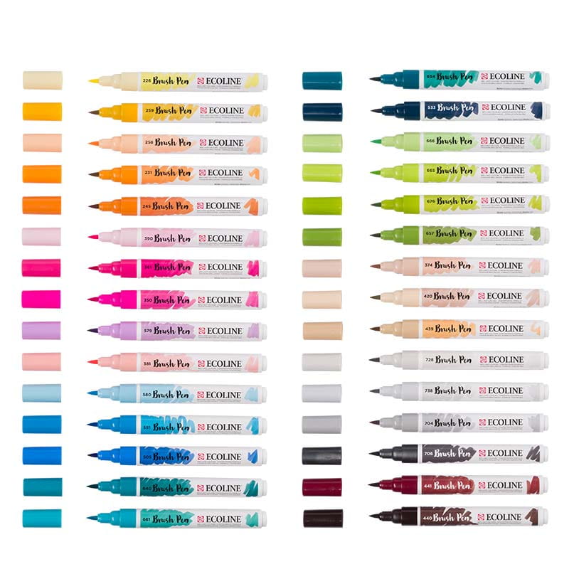 Zamknięta w poręcznym pisaku farba Ecoline zakończona pędzelkiem pozwala na łatwe i wygodne malowanie zarówno cienkich linii, jak i większych powierzchni. Ecoline Brush Pen posiadają bogatą paletę kolorystyczną oraz możliwość ponownego napełnienia pisaka farbami wodnymi Ecoline.