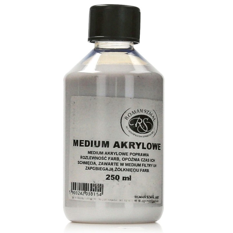 Medium akrylowe służy do rozcieńczania farb akrylowych oraz poprawy ich płynności. Idealnie ujednolica warstwy farb na płótnie oraz pomaga w zachowaniu gładkich krawędzi. Można również używać do samodzielnego sporządzenia farb z suchych pigmentów.