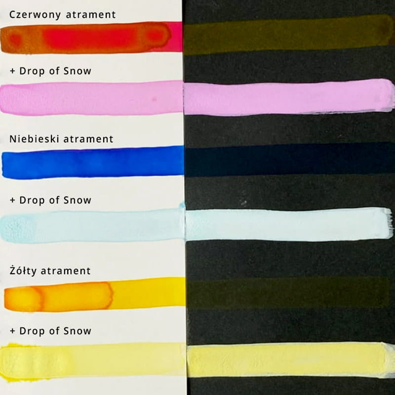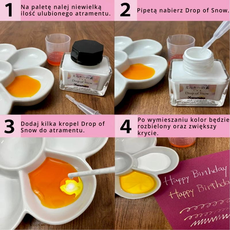 Kuretake Drop of Snow to specjalne białe medium, które pozwala na uzyskanie większego krycia i matowego wykończenia przy użyciu atramentów. Można je mieszać z seriami atramentów ink-cafe, takimi jak Meiji No Iro czy Art Nouveau. Produkt świetnie sprawdza się z piórem szklanym, stalówką lub pędzlem, jednak nie nadaje się do piór wiecznych z uwagi na zawartość pigmentów. Dzięki swojej wszechstronności i łatwości użycia jest idealnym rozwiązaniem do tworzenia bardziej intensywnych efektów w projektach artystycznych.