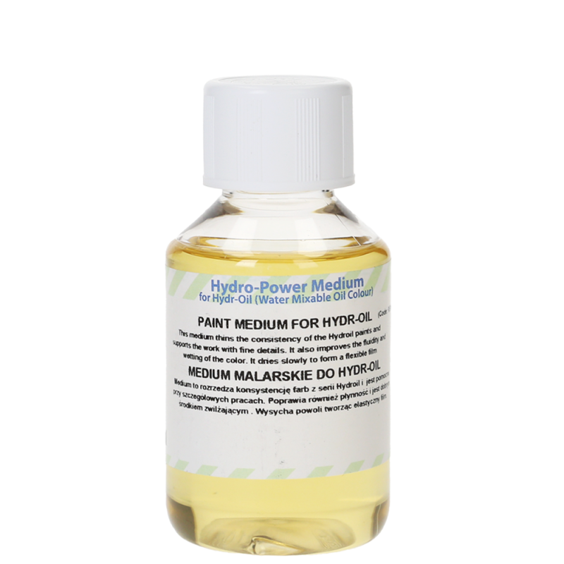 Medium malarskie Hydr-Oil 100 ml stworzone z myślą serii farb olejnych rozcieńczalnych wodą Hydr-Oil Renesans. Dodane do farby rozrzedza jej konsystencję, ułatwiając pracę – szczególnie dobrze sprawdzi się do prac wymagających wielu detali. Poprawia płynność i jest dobrym środkiem zwilżającym. Medium zachowuje właściwości wodorozcieńczalne farb, umożliwiając czyszczenie pędzli w wodzie.