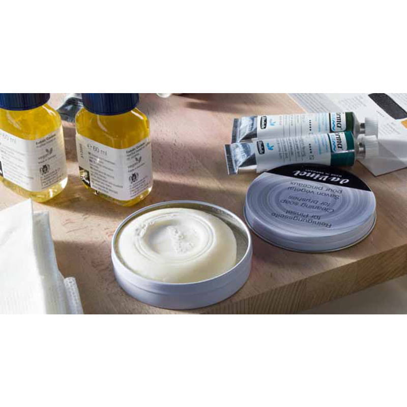 - Farby olejne: oczyść szmatką z grubszych warstw farby, następnie oczyść za pomocą terpentyny i jeszcze raz przetrzyj szmatką. Teraz pędzel jest wstępnie oczyszczony i można dokładnie wymyć resztki farby mydłem da Vinci i wodą. Na koniec uformuj pędzel w jego pierwotny kształt i zawsze pozwól mu dokładnie wyschnąć.