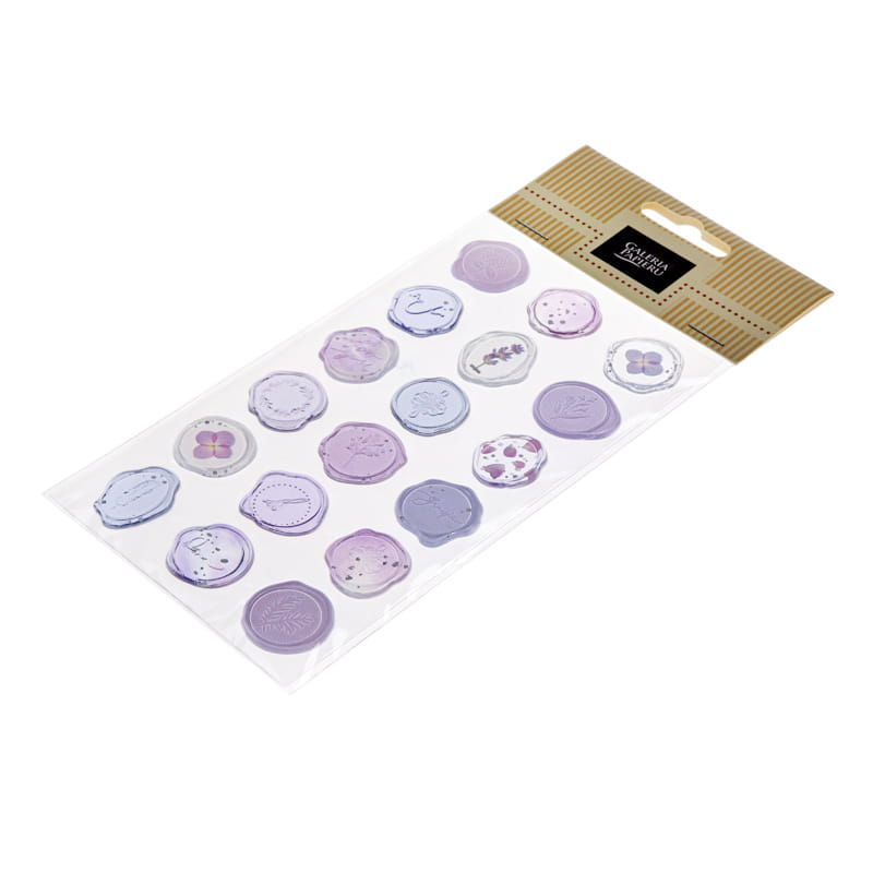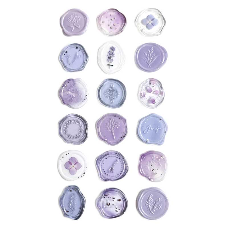 Samoprzylepne pieczątki wykonane z tworzywa sztucznego doskonale sprawdzą się przy dekorowaniu zaproszeń, kopert, albumów, kartek okolicznościowych, pudełek, torebek na prezenty oraz kopert. Dzięki swojej trójwymiarowości i nieregularnym kształtom wiernie imitują tradycyjne pieczęcie lakowe, nadając rękodziełom unikalnego i stylowego wyglądu. Opakowanie zawiera naklejki w różnych odcieniach fioletu i stopniu przejrzystości – kryjące, półtransparentne oraz transparentne. Są ozdobione fragmentami roślin i kwiatów, metalicznymi drobinkami oraz odciśniętymi wzorami.