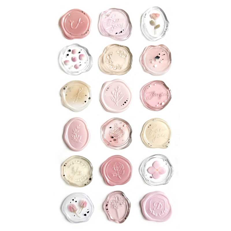 Samoprzylepne pieczątki wykonane z tworzywa sztucznego doskonale sprawdzą się przy dekorowaniu zaproszeń, kopert, albumów, kartek okolicznościowych, pudełek, torebek na prezenty oraz kopert. Dzięki swojej trójwymiarowości i nieregularnym kształtom wiernie imitują tradycyjne pieczęcie lakowe, nadając rękodziełom unikalnego i stylowego wyglądu. Opakowanie zawiera naklejki w różnych odcieniach różu i stopniu przejrzystości – kryjące, półtransparentne oraz transparentne. Są ozdobione fragmentami roślin i kwiatów, metalicznymi drobinkami oraz odciśniętymi wzorami.
