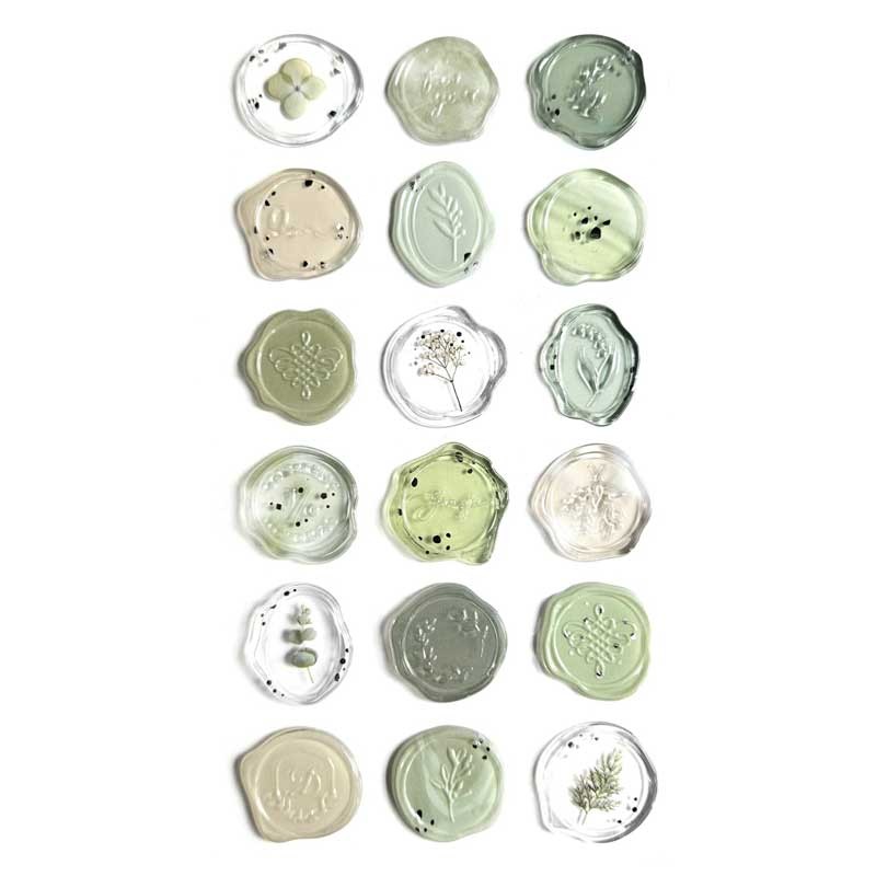 Samoprzylepne pieczątki wykonane z tworzywa sztucznego doskonale sprawdzą się przy dekorowaniu zaproszeń, kopert, albumów, kartek okolicznościowych, pudełek, torebek na prezenty oraz kopert. Dzięki swojej trójwymiarowości i nieregularnym kształtom wiernie imitują tradycyjne pieczęcie lakowe, nadając rękodziełom unikalnego i stylowego wyglądu. Opakowanie zawiera naklejki w różnych odcieniach zieleni i stopniu przejrzystości – kryjące, półtransparentne oraz transparentne. Są ozdobione fragmentami roślin i kwiatów, metalicznymi drobinkami oraz odciśniętymi wzorami.