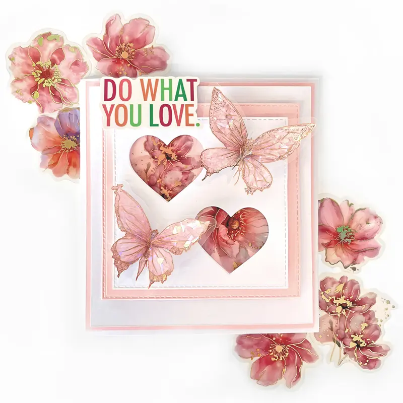 Naklejki dpCraft to wysokiej jakości ozdoby z transparentnej folii PET z motywami motyli w odcieniach różu. Wzory mają mieniące się elementy, które nadają im witrażowego charakteru.