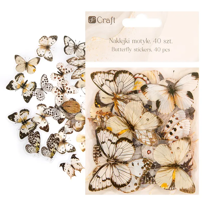 Naklejki dpCraft to wysokiej jakości ozdoby z transparentnej folii PET z motywami motyli w stonowanych kolorach. Satynowe wykończenie nadaje im subtelny, naturalny wygląd.