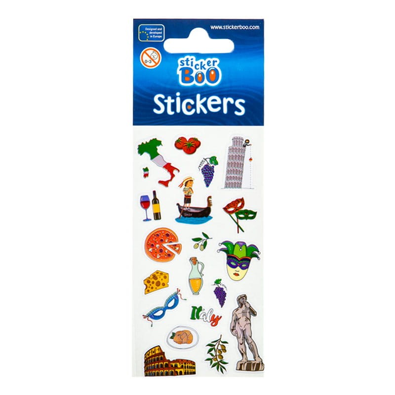 Naklejki Sticker BOO Italy na arkuszu o wymiarach 6 x 18 cm. Idealne dla najmłodszych do urozmaicania zeszytów, notesów, kolekcjonowania oraz scrapbookingu i bullet journali. Znajdziesz naklejki wszystkiego co związane z Włochami.