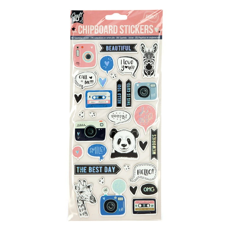Craft ID chipboard stickers to naklejki ozdobne w różnych rozmiarach i wzorach umieszczone na arkuszu o rozmiarze 31 x 15 cm. Posiadają certyfikat FSC.
