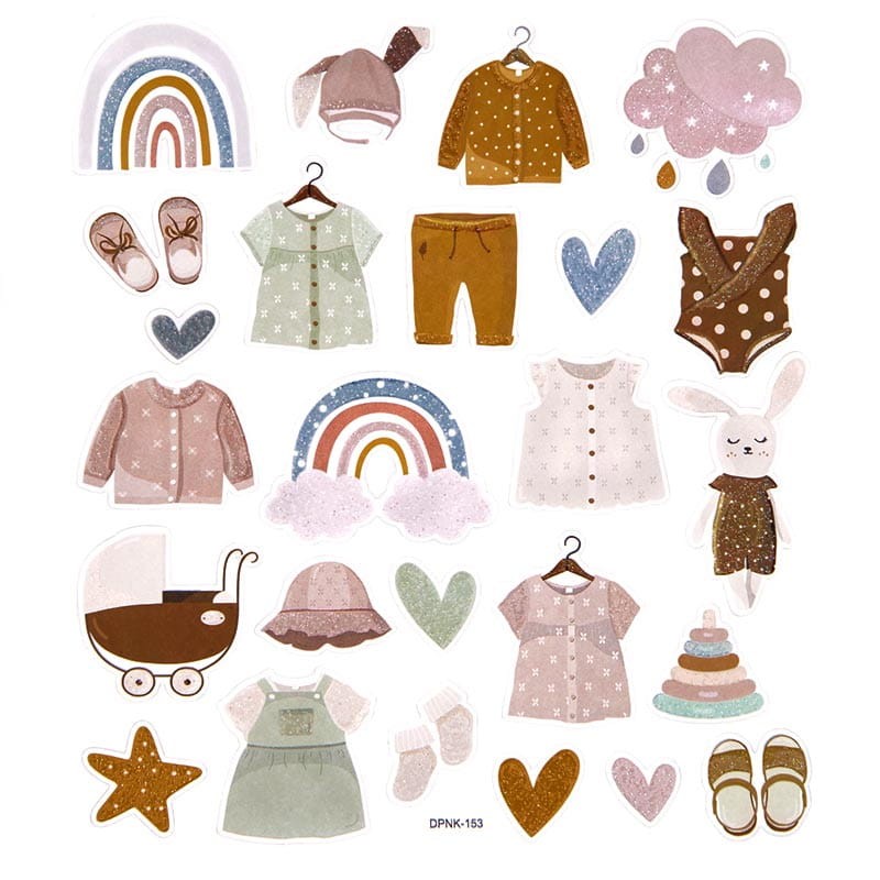 Dodatkowo dodają delikatny połysk opalizującym brokatem i występują w stonowanych kolorach brązu, różu i niebieskiego, doskonale pasujących do projektów craftowych i vintage. Opakowanie zawiera 25 sztuk naklejek o wymiarach 15 x 17 cm, które można również wykorzystać do ozdabiania zaproszeń czy albumów. Dodatkowo dostępne są również pasujące kształty papierowe Baby.