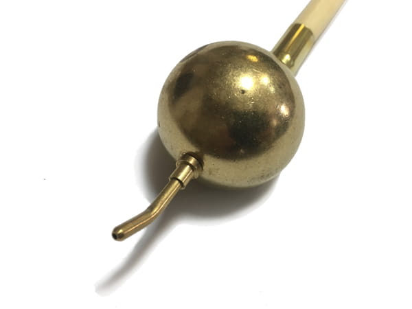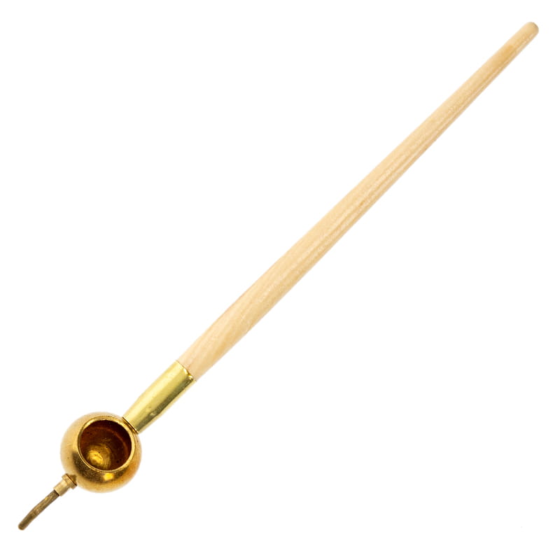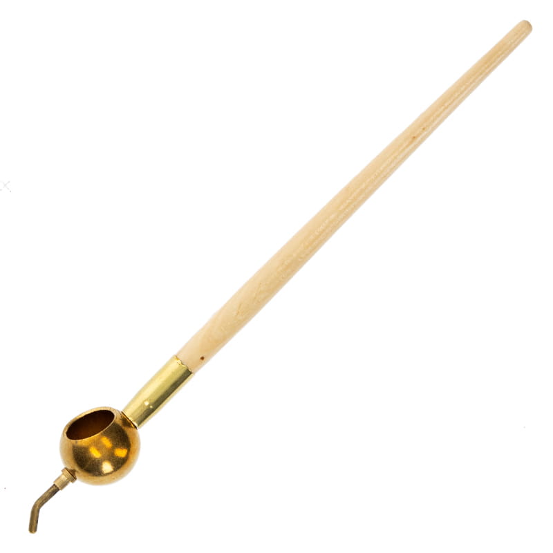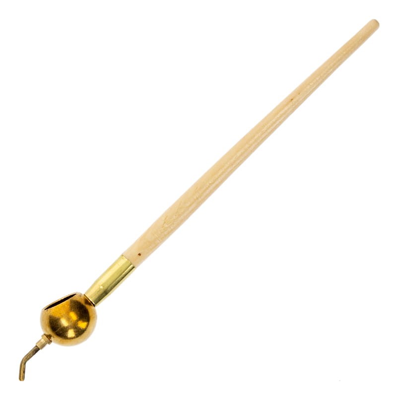 Narzędzie z bańką służy do nakładania wosku na tkaniny. Do mosiężnego zbiorniczka należy wlać rozgrzany, płynny wosk i wykonać nim pożądane wzory. Wosk wypływa na tkaninę przez rurkę o szer. 1mm.