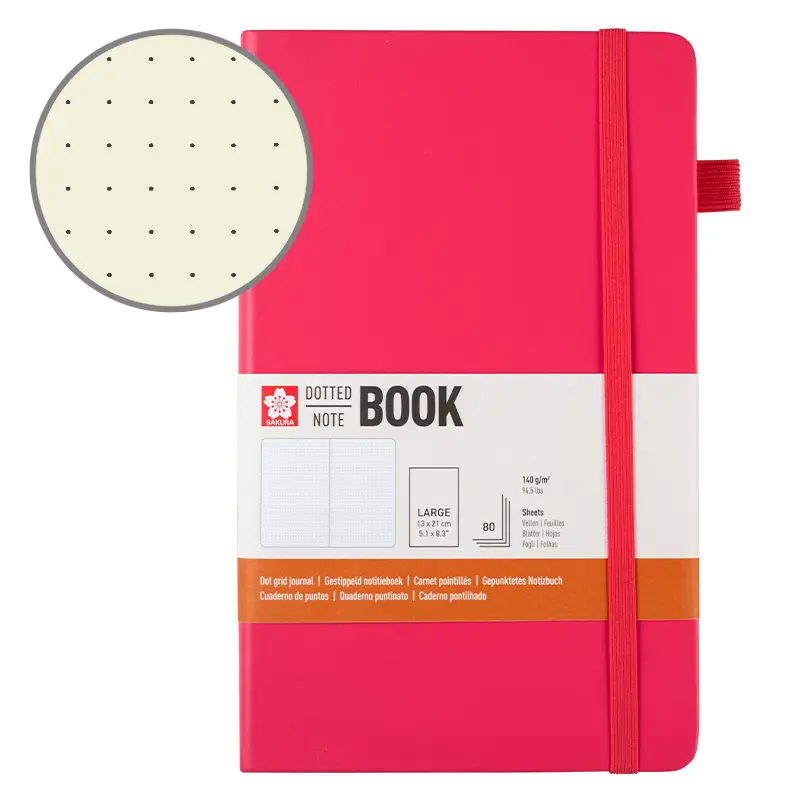 Notes z papierem dot w twardej skóropodobnej oprawie, posiada zaokrąglone rogi, zamknięcie na gumkę oraz kieszonkę na luźne notatki. Dodatkowo wyposażony w gumowy uchwyt na długopis lub ołówek. Elegancki i funkcjonalny design sprawia, że jest to doskonałe narzędzie do planowania, twórczości i codziennego notowania.