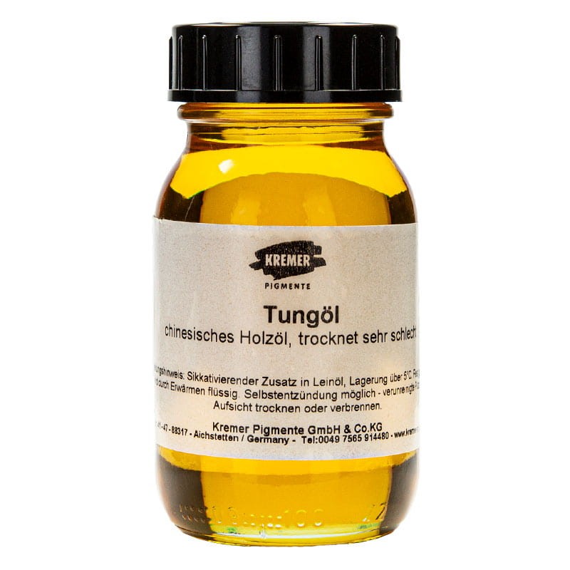 Pozyskiwany z orzechów tungowca, nazywany również olejem chińskim lub olejem drzewnym, Wysycha w ciągu 2 dni, Grubsze warstwy mogą wymagać do 14 dni na pełne wyschnięcie. Utwardzanie zachodzi głęboko w warstwie, co zapewnia elastyczność i redukuje ryzyko pękania powierzchni. Dodanie oleju tungowego do farb olejnych zwiększa elastyczność powłoki malarskiej i pomaga zapobiegać pękaniu farby na powierzchni. Używany w dużych ilościach może powodować ciemnienie warstwy malarskiej.