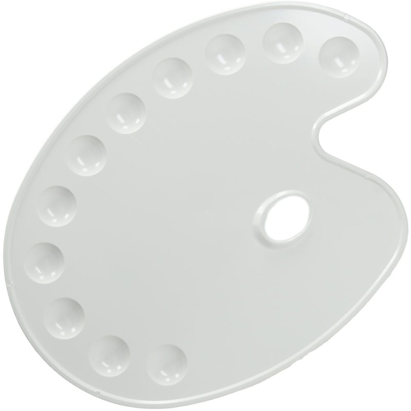 Owalna paletka malarska wykonana z trwałego tworzywa sztucznego. Posiada 11 wgłębień na farby oraz specjalnie wyprofilowany otwór na palec. Wygodna i komfortowa w użyciu plastikowa paleta malarska idealnie sprawdzi się do farb wodnych, takich jak farby akrylowych, temper oraz akwareli.