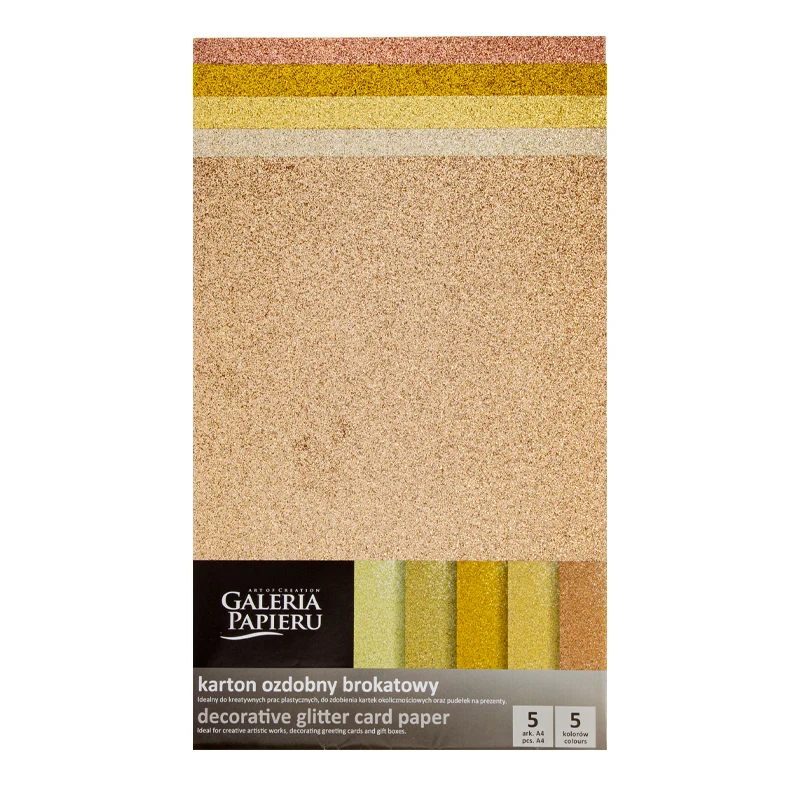 Wyjątkowy papier brokatowy A4 do kreatywnych projektów o intensywnej, brokatowej fakturze oraz pięknym połysku. To wysokiej jakości, trwały papier ozdobny, który nie osypuje się podczas pracy.