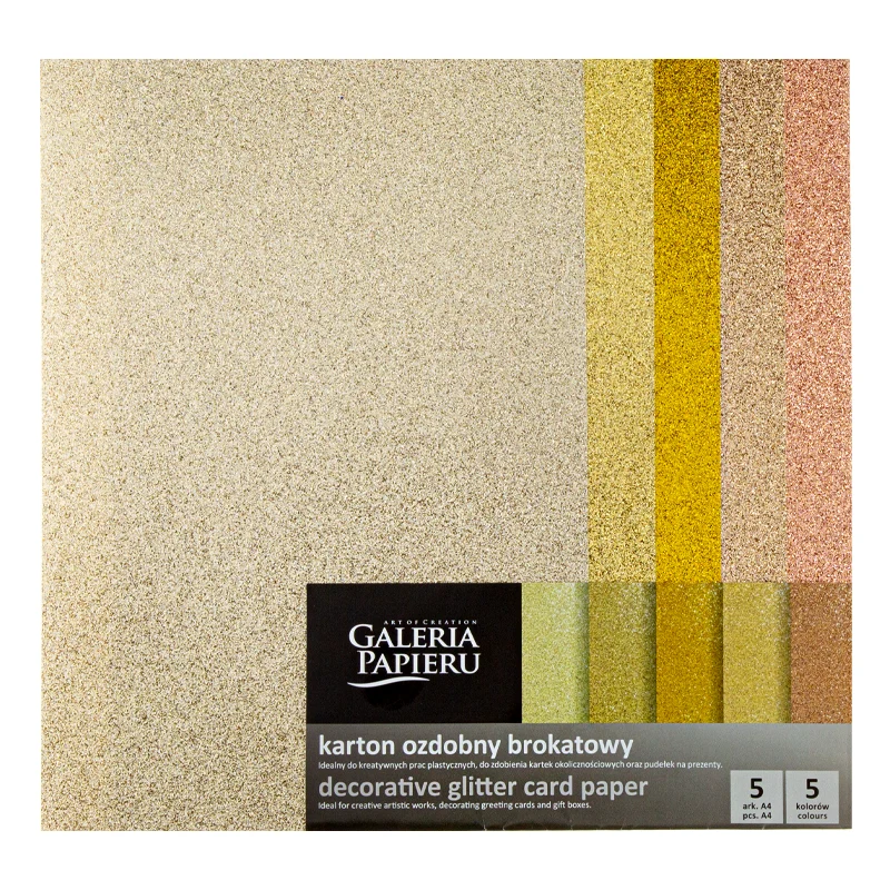 W zestawie znajdziesz 5 arkuszy papieru ozdobnego A4, każdy w innym odcieniu złota.