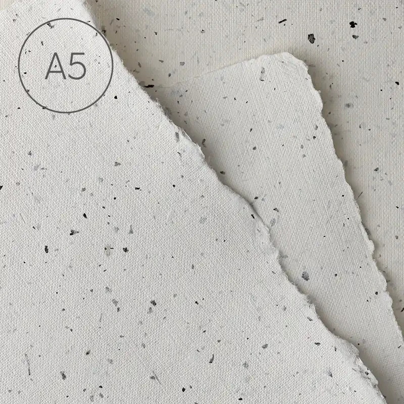 Papier czerpany w formacie A5 o fakturze lnu z fragmentami mięty. Został przystosowany do drukarek atramentowych i niektórych laserowych.