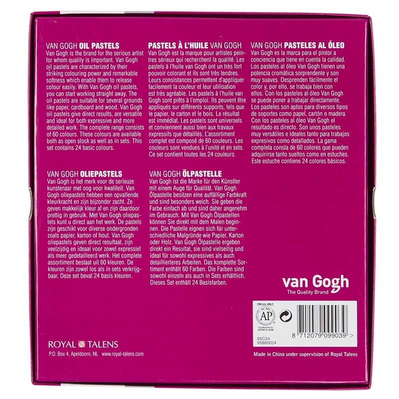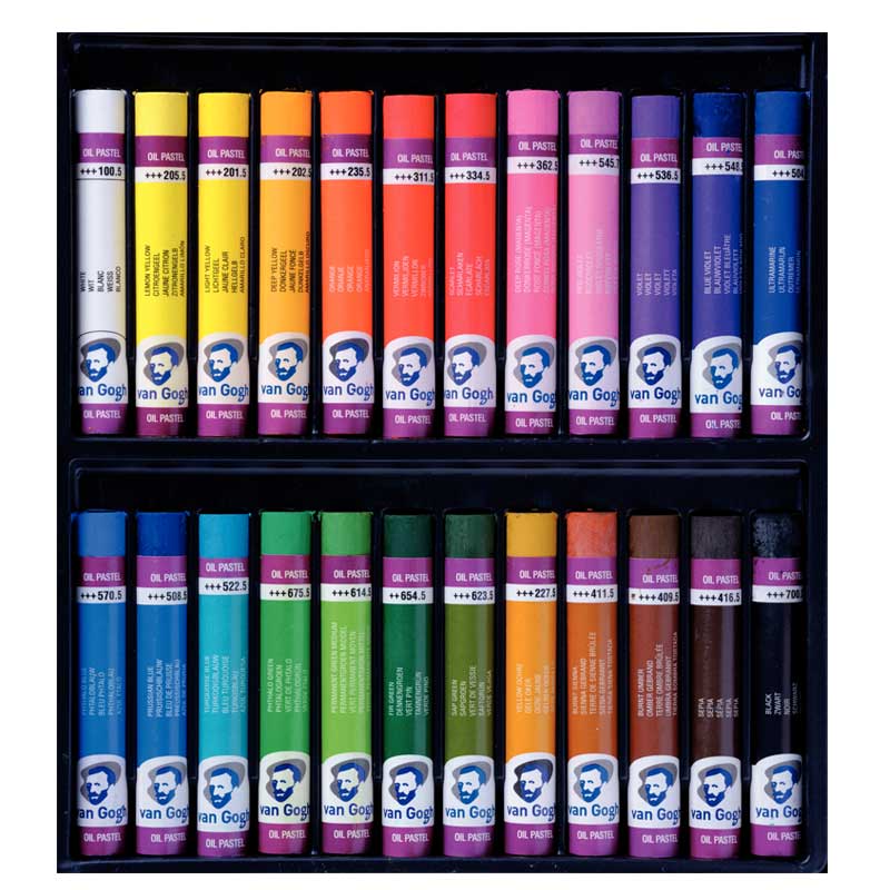 Pastele olejne Van Gogh wykonane są z najwyższej jakości pigmentów, olejów mineralnych i spoiwa woskowego co pozwala na miękkie, gładkie i bezpyłowe rysowanie przy zachowaniu intensywnych kolorów. Pastele z tej serii łatwo łączą się ze sobą umożliwiając nakładanie na siebie kolejnych warstw. Dla uzyskania efektu farb olejnych, pastele można używać na mokro z terpentyną lub roztworem mineralnym. Nadają się na podłoża różnego rodzaju. Cała gama składa się z 60 kolorów dostępnych również w zestawie.