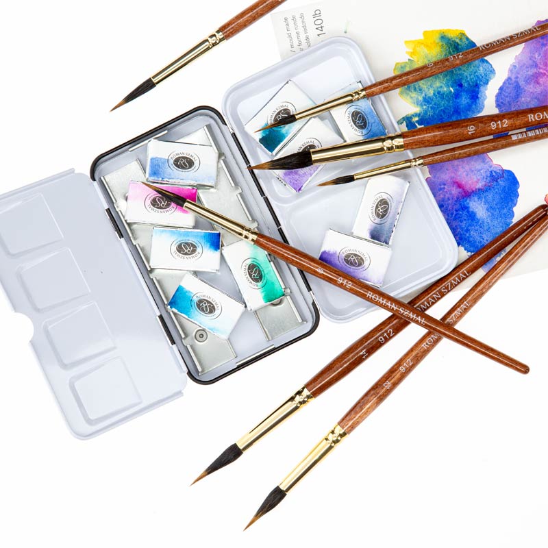 Ręcznie wykonane pędzle akwarelowe Roman Szmal 912 to wysokiej jakości narzędzia malarskie wykonane z naturalnego włosia sobolowego otoczone włosiem wiewiórki , idealne do malarstwa akwarelowego, ale również innych technik wodnych jak tusz, gwasz czy malarstwo na jedwabiu.