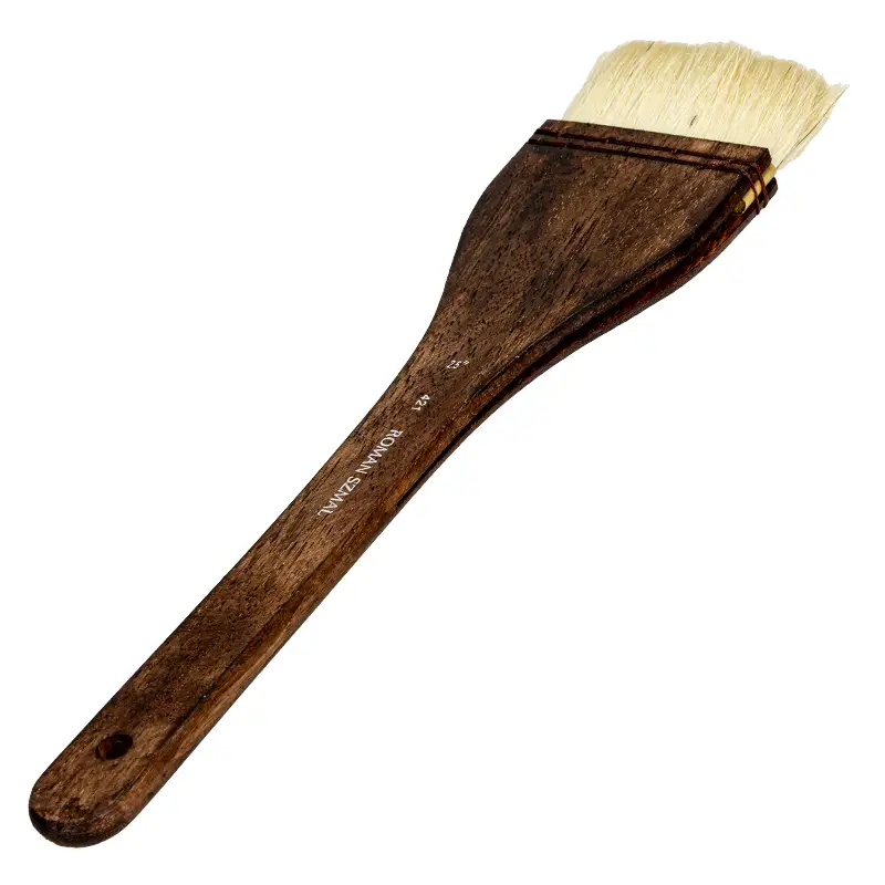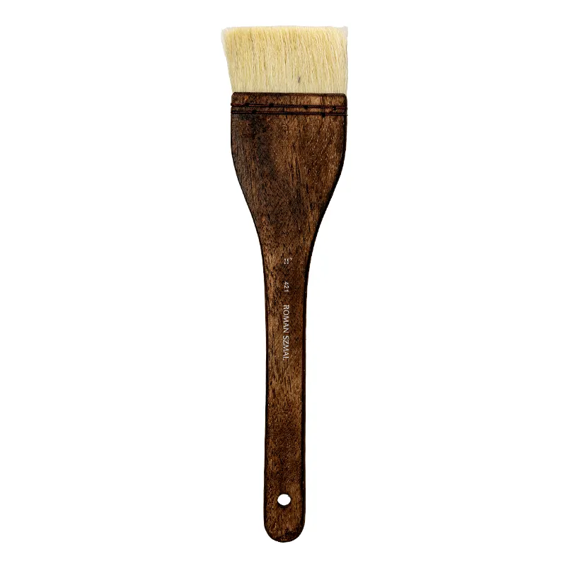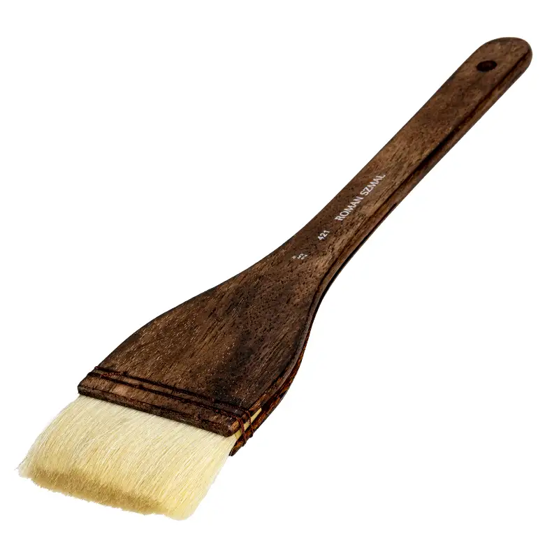 Seria 421 Roman Szmal Art to klasyczny pędzel akwarelowy typu HAKE, stworzony z myślą o pracy na dużych formatach. Wykonany z naturalnego włosia kozy, łączy w sobie wysoką chłonność, miękkość i sprężystość. Osadzenie na długim trzonku ułatwia pracę na większych formatach.