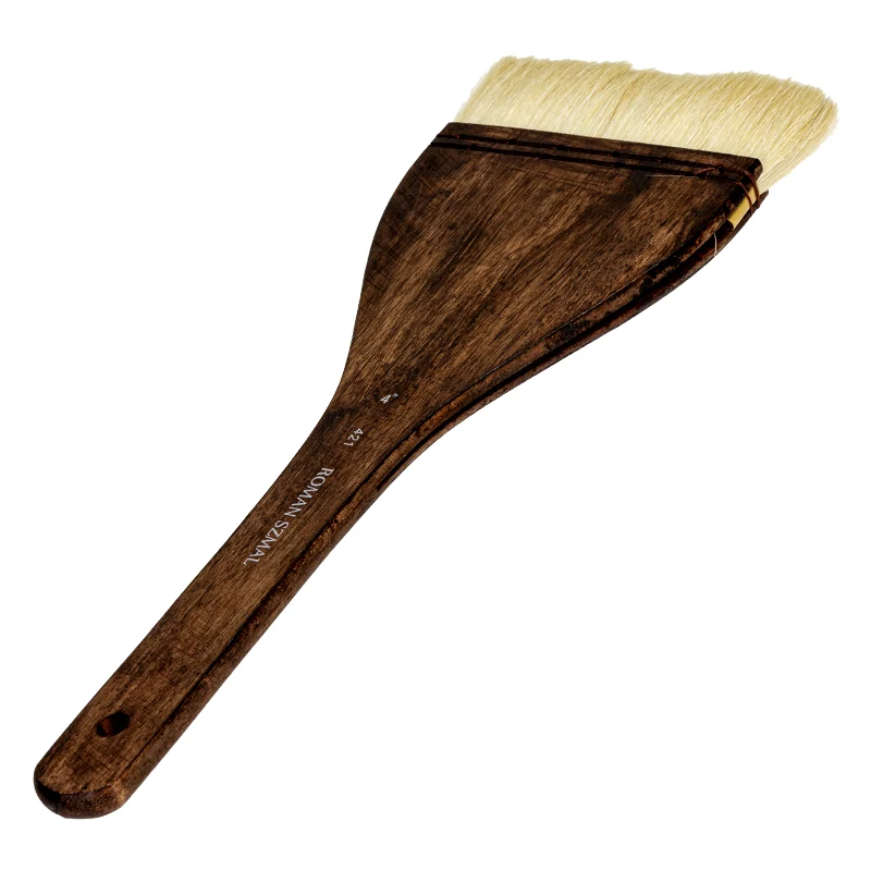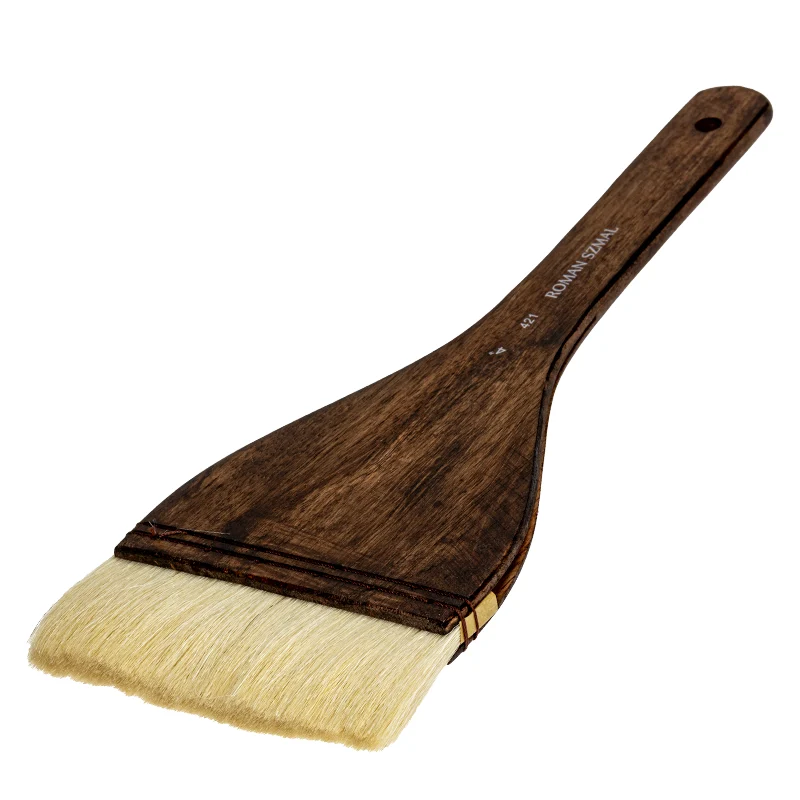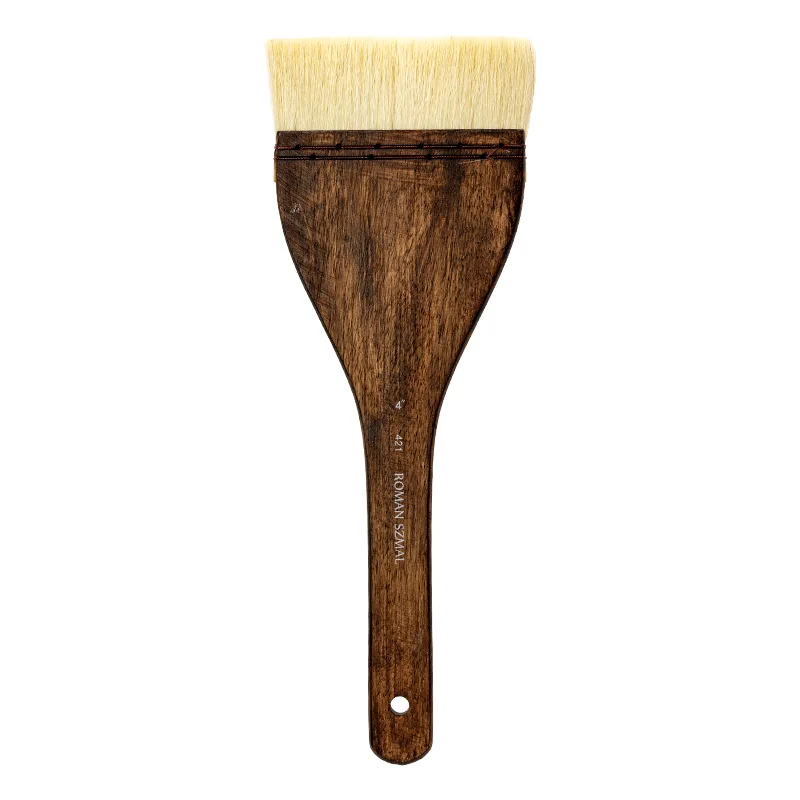 Seria 421 Roman Szmal Art to klasyczny pędzel akwarelowy typu HAKE, stworzony z myślą o pracy na dużych formatach. Wykonany z naturalnego włosia kozy, łączy w sobie wysoką chłonność, miękkość i sprężystość. Osadzenie na długim trzonku ułatwia pracę na większych formatach.