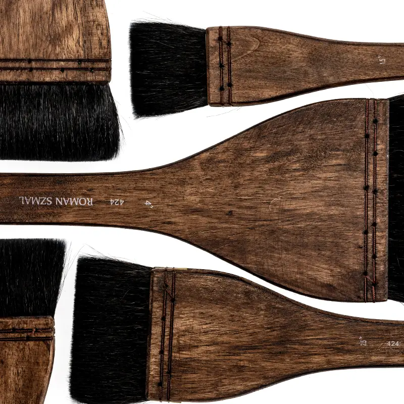 Długi trzonek pędzla wykonany z drewna o wysokim zabezpieczeniu przed namakaniem, wytrzyma nawet wielogodzinną pracę w technikach wodnych, bez obaw o zniekształcenie i pękanie drewna. Charakterystyczny sposób osadzenia włosia w rozcięciu trzonka, oraz ręczne szycie łączące trzonek z włosiem, nadaje tej serii pędzli szlachetny, rzemieślniczy wygląd.
