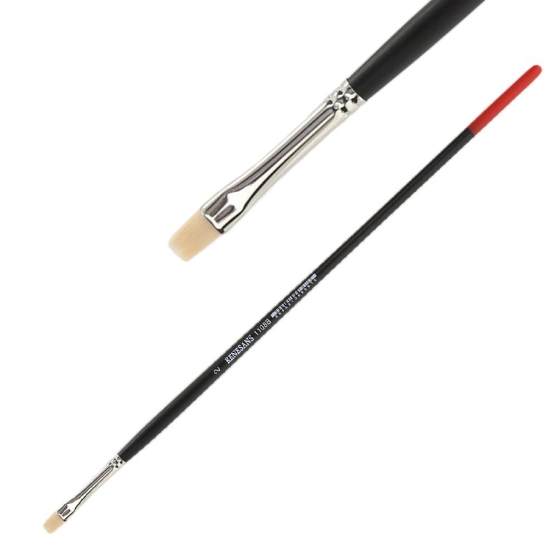 Pędzle 1108B to seria wysokiej jakości pędzli płaskich z syntetycznej szczeciny osadzonej w malowanej na czarno, nielakierowanej rączce. Przeznaczone szczególnie do farb olejnych ze względu na twarde i grube włosie, pozostawiające ślad pędzla.