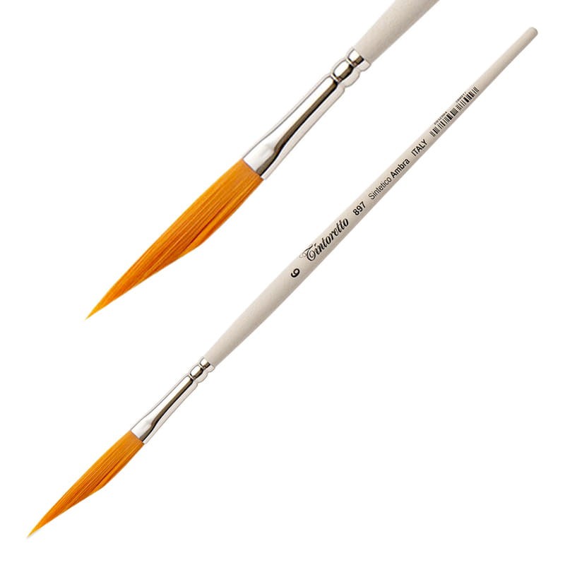 Pędzle Tintoretto seria 897 - Sintetico Ambra wykonane są z bursztynowego, syntetycznego włosia w kształcie sztyletu. Seria ta jest owocem współpracy z francuską akwarelistką Reine Marie Pinchon. Pędzle mają doskonałe parametry elastyczności i higroskopijności, dedykowane są do pracy w technikach wodnych jak akwarela czy tusz. Kształt sztyletu i wydłużone włosie jest niezastąpione przy tworzeniu długich, cienkich i precyzyjnych linii.