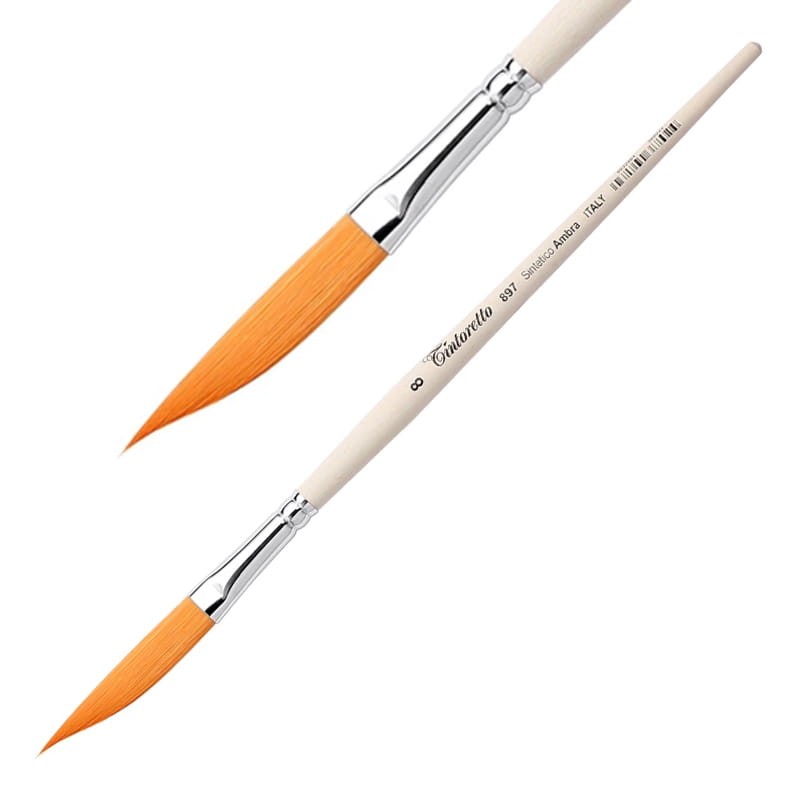 Pędzle Tintoretto seria 897 - Sintetico Ambra wykonane są z bursztynowego, syntetycznego włosia w kształcie sztyletu. Seria ta jest owocem współpracy z francuską akwarelistką Reine Marie Pinchon. Pędzle mają doskonałe parametry elastyczności i higroskopijności, dedykowane są do pracy w technikach wodnych jak akwarela czy tusz. Kształt sztyletu i wydłużone włosie jest niezastąpione przy tworzeniu długich, cienkich i precyzyjnych linii.