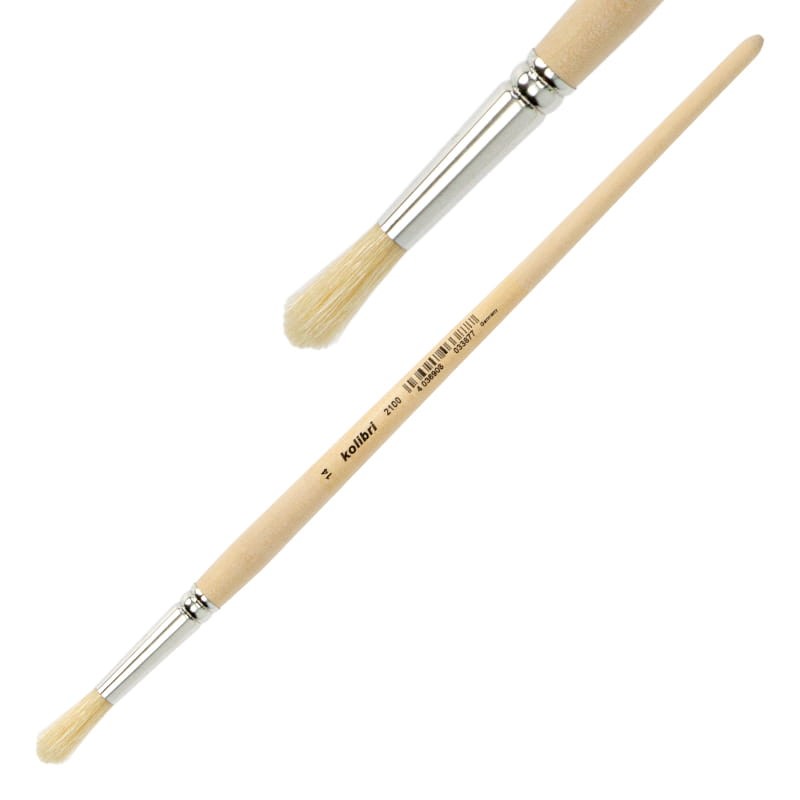 Pędzel Kolibri 2100 wykonany z wysokiej jakości bardzo mocnej białej szczeciny świńskiej o doskonałej elastyczności. Charakterystyczne dla wysokiej jakości szczeciny mocne rozwarstwienie włosia na końcach tzw. flagi włosia zwiększają jego chłonność i pozwalają na bardziej komfortową pracę.