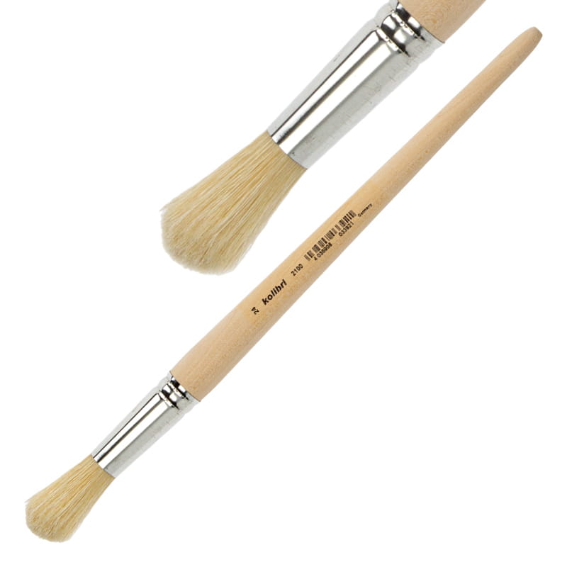 Pędzel Kolibri 2100 wykonany z wysokiej jakości bardzo mocnej białej szczeciny świńskiej o doskonałej elastyczności. Charakterystyczne dla wysokiej jakości szczeciny mocne rozwarstwienie włosia na końcach tzw. flagi włosia zwiększają jego chłonność i pozwalają na bardziej komfortową pracę.
