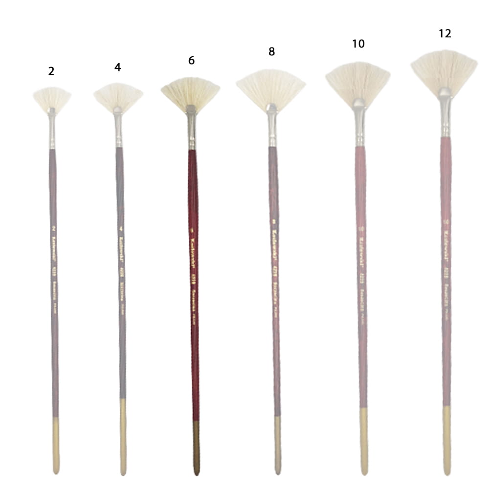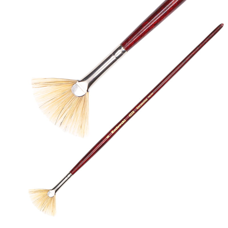 Pędzel wachlarzowy wykonany z białej szczeciny, umieszczonej w srebrnej skuwce na długim lakierowanym trzonku. Pędzel do malowania farbami olejnymi, używany również do nakładania ciekawych struktur farbami akrylowymi, plakatowymi czy gwaszami.