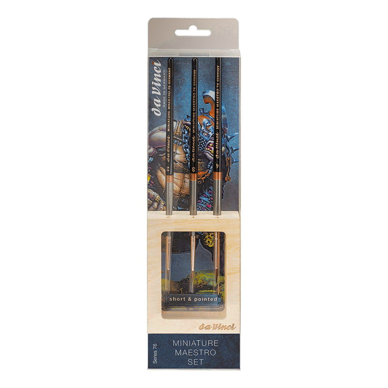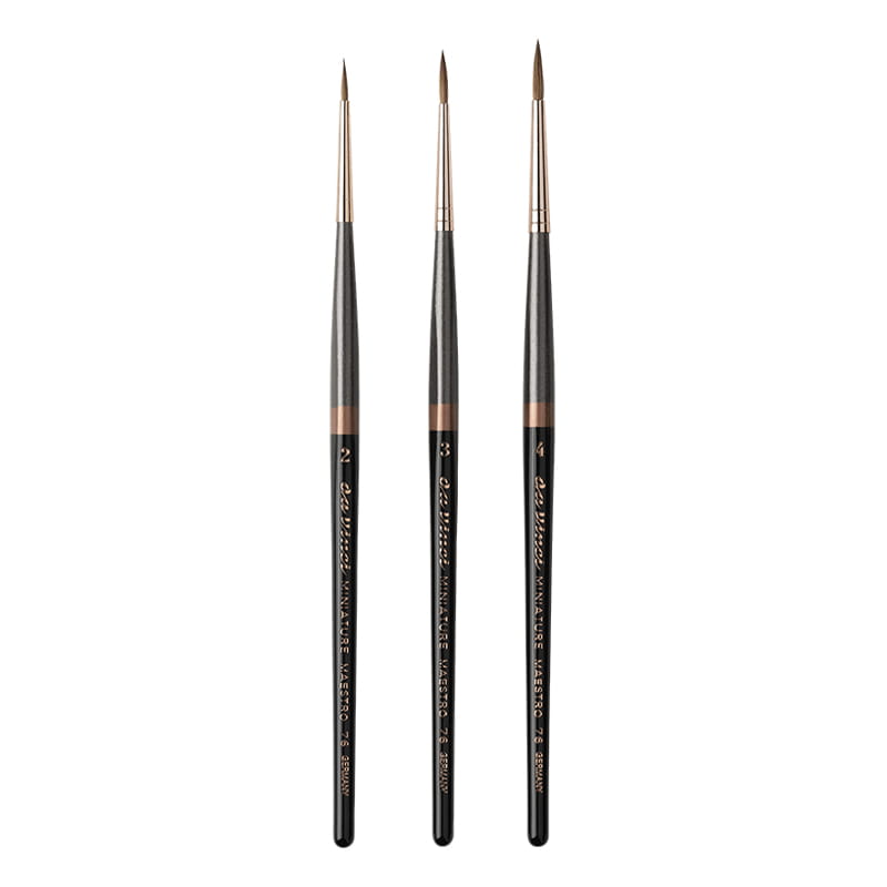 Zestaw trzech pędzli do miniatur, wykonanych ze znanego z doskonałej jakości naturalnego włosia Kolinsky Red Sable, zapewniający najwyższy komfort pracy i precyzję. Włosie to posiada świetne właściwości chłonięcia wody i farby, którą następnie równomiernie uwalnia na papier lub inną powierzchnię. Pędzle da Vinci Miniature Maestro są doskonałe do akwareli, tuszy akrylowych, płynnych farb akrylowych i innych płynnych mediów. Idealne do malowania akwarelowych detali, liternictwa i malowania figurek tuszami akrylowymi.