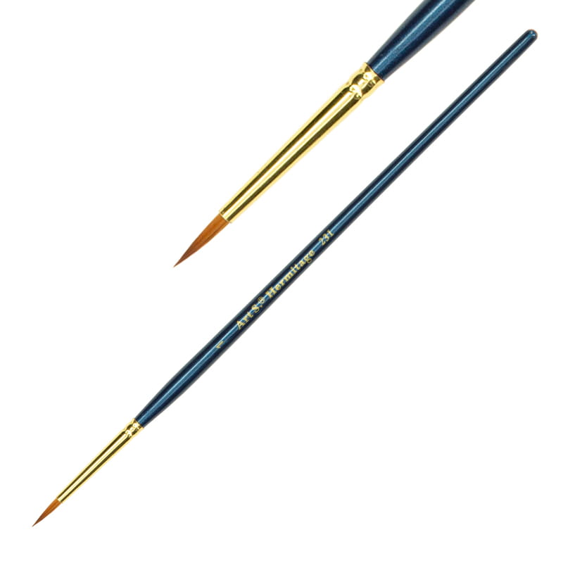 Pędzle linii Hermitage Round 231 wykonane są z wysokiej jakości włosia syntetycznego o dużej elastyczności, okrągłym kształcie i precyzyjnym szpicu. Charakterystyczny kształt szeroki u nasady i zwężający się ku końcowi pozwala jednocześnie na uzyskanie bardzo precyzyjnych linii i kształtów, jak i szerokich, swobodnych pociągnięć pędzla. To uniwersalny pędzel, który sprawdzi się do farb akrylowych , olejnych, gwaszy czy farb plakatowych, jak również w wielu innych technikach plastycznych. Włosie syntetyczne w kolorze jasnego brązu cieniowane do ciemnego brązu, ujęte jest w złotą skuwkę. Trzonek wykonany z drewna pokrytego lakierem w kolorze indygo. Całość pięknie komponuje się kolorystycznie . Oferta pędzli Hermitage Round 231 obejmuje 15 rozmiarów.