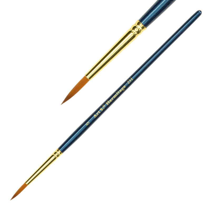Pędzle linii Hermitage Round 231 wykonane są z wysokiej jakości włosia syntetycznego o dużej elastyczności, okrągłym kształcie i precyzyjnym szpicu. Charakterystyczny kształt szeroki u nasady i zwężający się ku końcowi pozwala jednocześnie na uzyskanie bardzo precyzyjnych linii i kształtów, jak i szerokich, swobodnych pociągnięć pędzla. To uniwersalny pędzel, który sprawdzi się do farb akrylowych , olejnych, gwaszy czy farb plakatowych, jak również w wielu innych technikach plastycznych. Włosie syntetyczne w kolorze jasnego brązu cieniowane do ciemnego brązu, ujęte jest w złotą skuwkę. Trzonek wykonany z drewna pokrytego lakierem w kolorze indygo. Całość pięknie komponuje się kolorystycznie . Oferta pędzli Hermitage Round 231 obejmuje 15 rozmiarów.