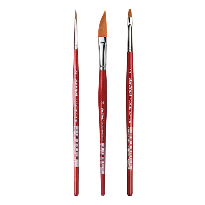 Zestaw trzech miękkich pędzli syntetycznych firmy da Vinci, przeznaczonych do malarstwa akwarelowego i innych farb wodnych jak gwasze czy tempery. Włosie pędzli jest elastyczne i miękkie, a końcówka precyzyjna, co pozwala na komfortową, przyjemną pracę. Syntetyczne włosie o wysokiej absorbcji farby, i stopniowym oddawaniu jej na papier doskonale sprawdzi się w technice akwareli, jak i innych pokrewnych technikach takich jak tusz czy gwasz. Pędzle mają drewniany lakierowany na czerwono trzonek o charakterystycznym kształcie "esagonal handle" opatentowanym przez firmę da Vinci dla bardziej komfortowej pracy - rękojeść ta posiada w najgrubszym miejscu sześć niezauważalnych spłaszczeń, które są wyprofilowane w taki sposób, aby nie męczyły dłoni podczas malowania i nie utrudniały obracania i manewrowania pędzlem (rozmiary do 6 posiadają tylko 3 spłaszczenia ze względu na mniejszą średnicę końcówki).