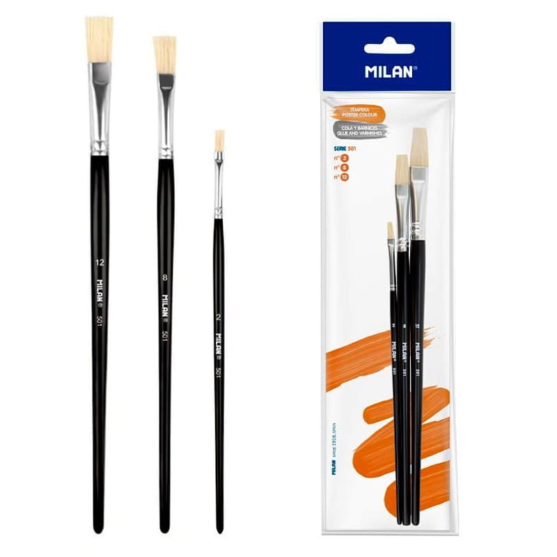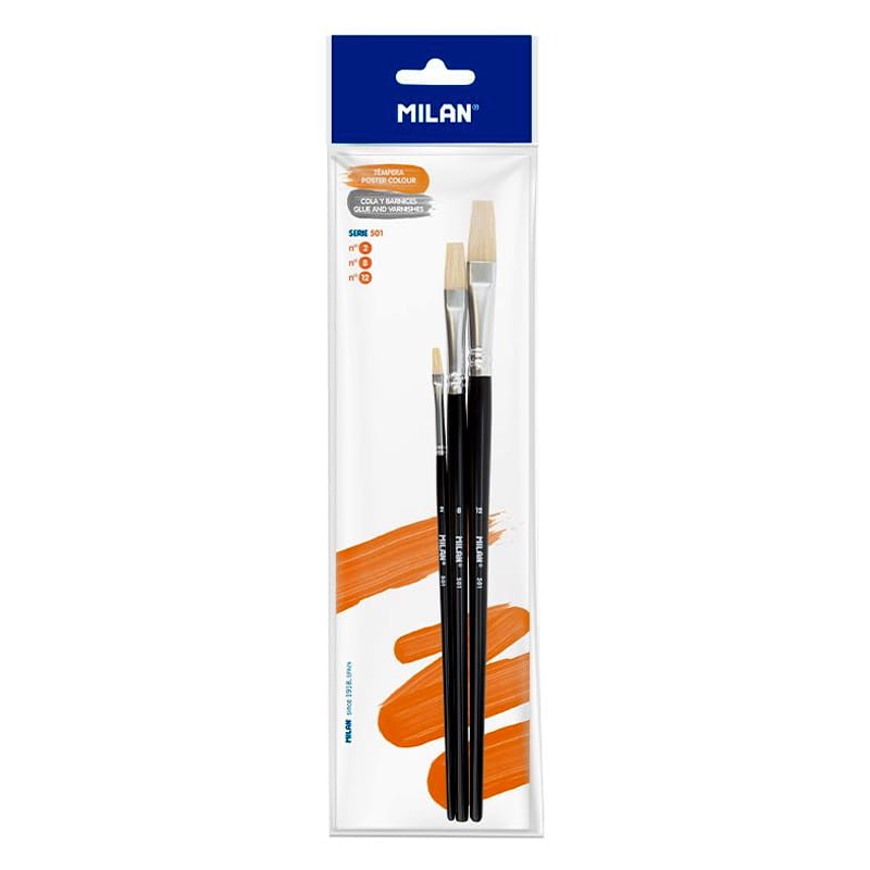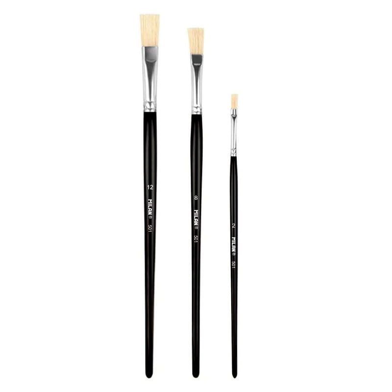 Pędzle Milan serii 501 nr 2, 8, 12 płaskie ze szczeciny Chungking zestaw 3 szt. na blistrze