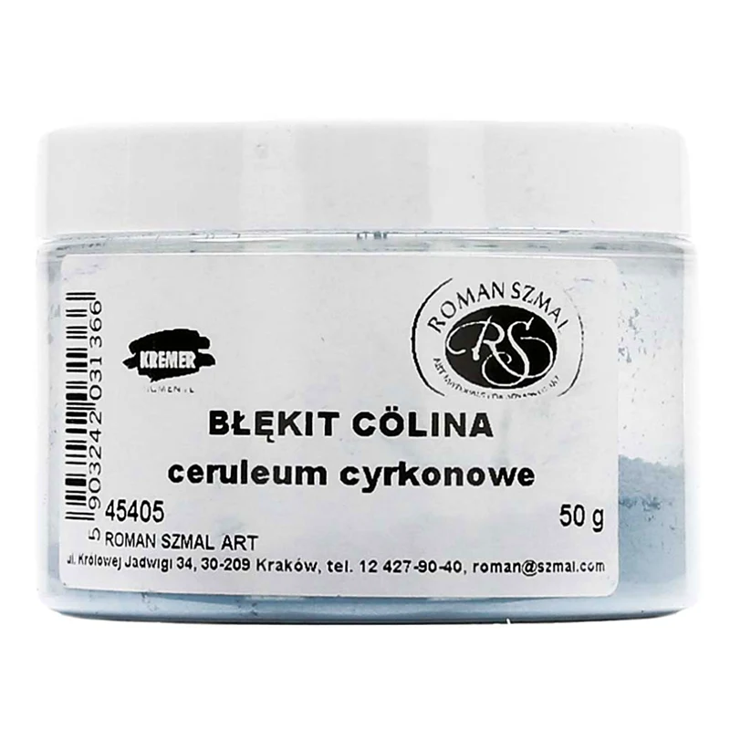 Wysokiej jakości pigment nieorganiczny firmy Roman Szmal Art o jasnym, delikatnym, błękitnym odcieniu. Stanowi bezpieczną, nietoksyczną alternatywę dla tradycyjnego błękitu ceruleum, ponieważ nie zawiera kobaltu. Charakteryzuje się trwałością i odpornością na działanie światła słonecznego.