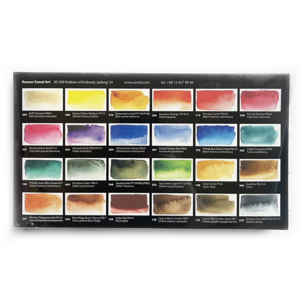 Komplet 24 kolorów wybrany przez akwarelistkę Jane Blundell, członkini najstarszego Australijskiego Instytutu Akwareli.