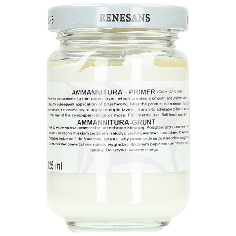 Grunt Ammanitura firmy RENESANS to zaprawa do gruntowania powierzchni złoconych, stosowana w technice klejowej. Przed użyciem podkład należy podgrzać poprzez zanurzenie go w gorącej wodzie oraz dobrze wymieszać. Należy pamiętać, że w przypadku tej techniki powierzchnia musi być idealnie gładka, aby złocenie przyniosło zamierzony efekt. Grunt nakładamy miękkim pędzlem i pozostawiamy do wyschnięcia. Aby powierzchnia była dobrze przygotowana potrzebne są 2-5 warstw produktu. Co dwie warstwy, powierzchnię warto przetrzeć drobnym papierem ściernym lub wilgotną gąbką.