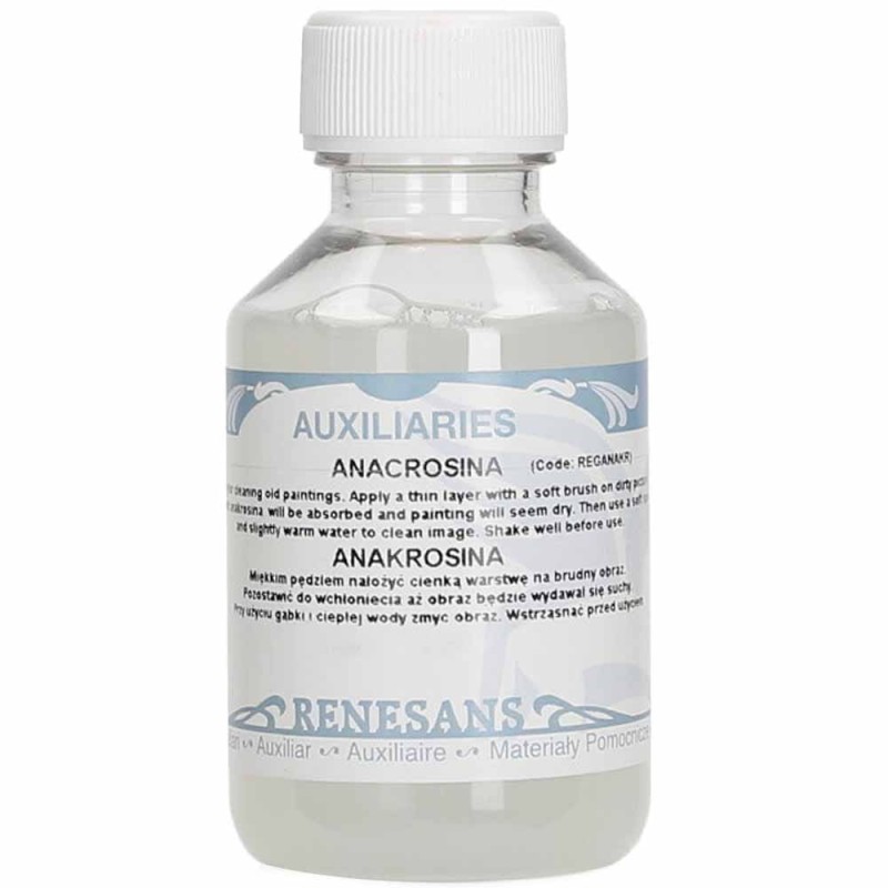 Anakrosina to emulsja na bazie wody, mydła i węglanu amonu przeznaczona do czyszczenia starych obrazów. Za pomocą miękkiego pędzla lub gąbki nanosimy płyn na obraz i pozostawiamy na krótką chwilę, aż płyn zacznie działać. Następnie zwilżoną w ciepłej wodzie miękką szmatką przecieramy obraz, usuwając płyn wraz z zabrudzeniami. W celu złagodzenia działania rozcieńczyć ciepłą wodą. Wstrząsnąć przed użyciem.