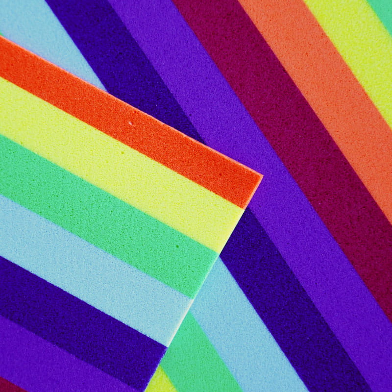 - Miękkie i elastyczne arkusze z kolorowej mikrogumy, z efektem pasków ułożonych w kolory tęczy.