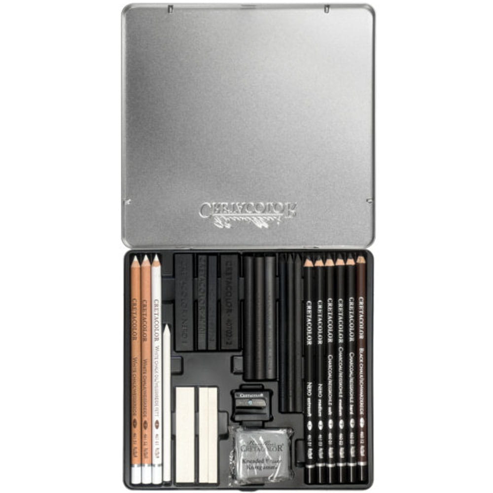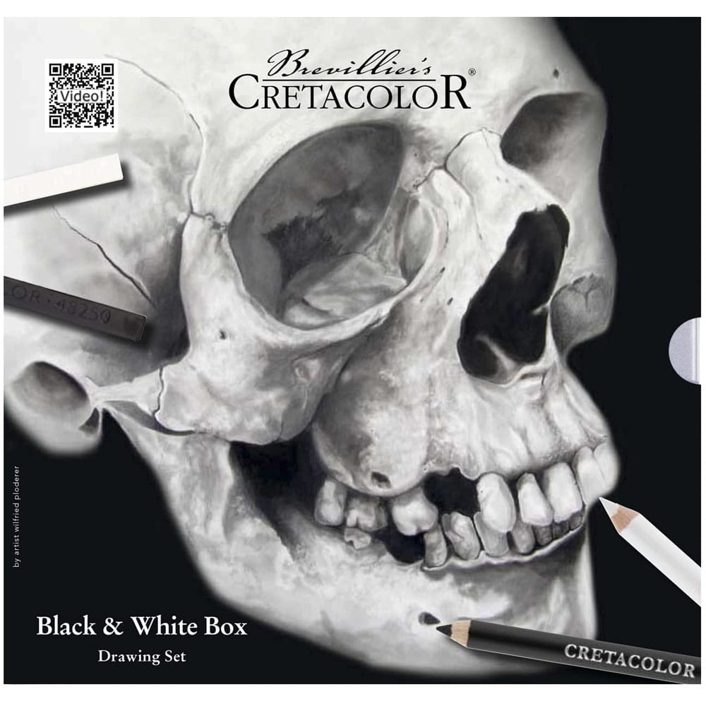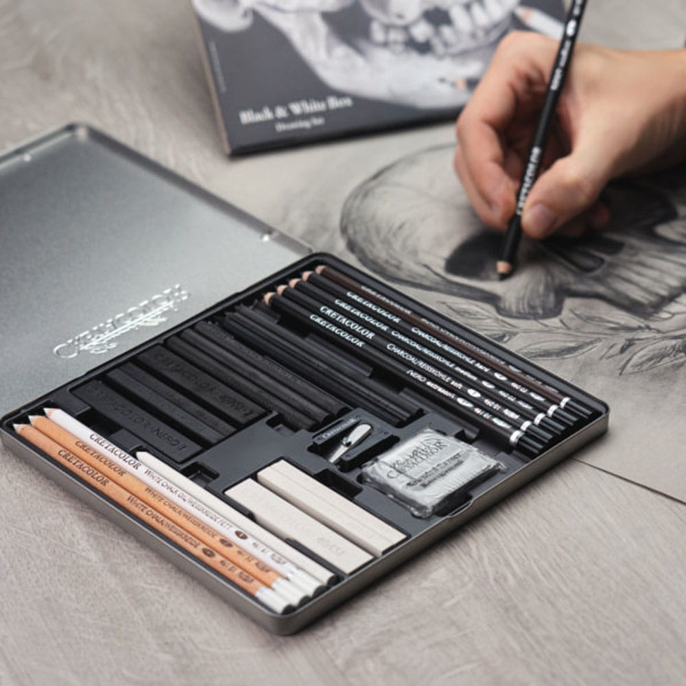 Zestaw szkicowy Black & White Box CRETACOLOR Skull zawiera 25 elementów do rysunku w czerni i bieli. Komplet stworzony z myślą o artystach lubiących podkreślać grę światła i cienia w swoich pracach. Posługujących się silnym kontrastem miedzy tymi kolorami. Zestaw zawiera biel i czerń w różnej formie i konsystencji: