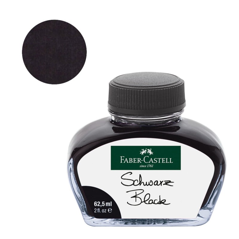 Wysokiej klasy czarny atrament FABER-CASTELL do piór wiecznych w eleganckim, szklanym flakonie o pojemności 62,5 ml.