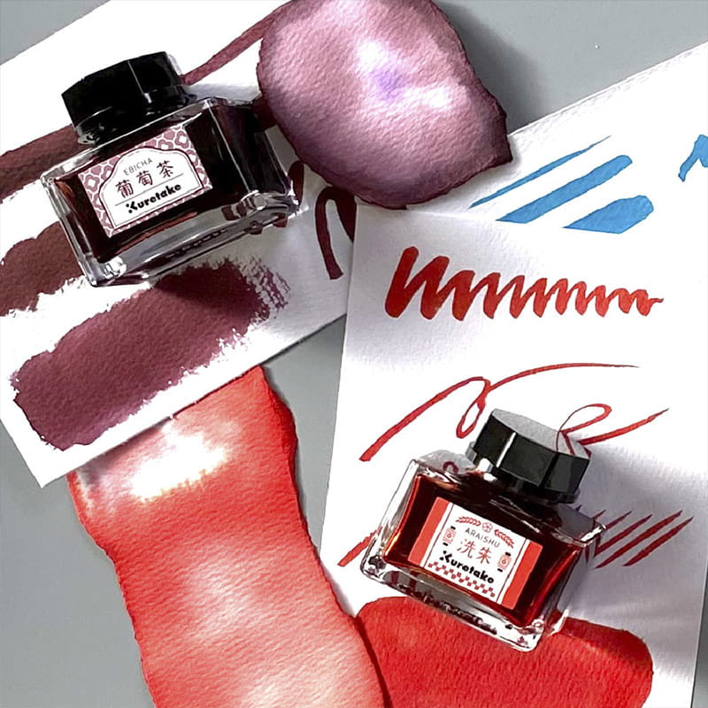 Atramenty Kuretake Meiji no Iro mimo dość gęstej konsystencji są odpowiednie do napełniania pióra wiecznego, świetnie sprawdzą się również do pisaka lub pędzla. Zapewniają płynne pisanie przy użyciu piór i jednocześnie oferują wysoki stopień krycia, gdy są używane z pędzlem.