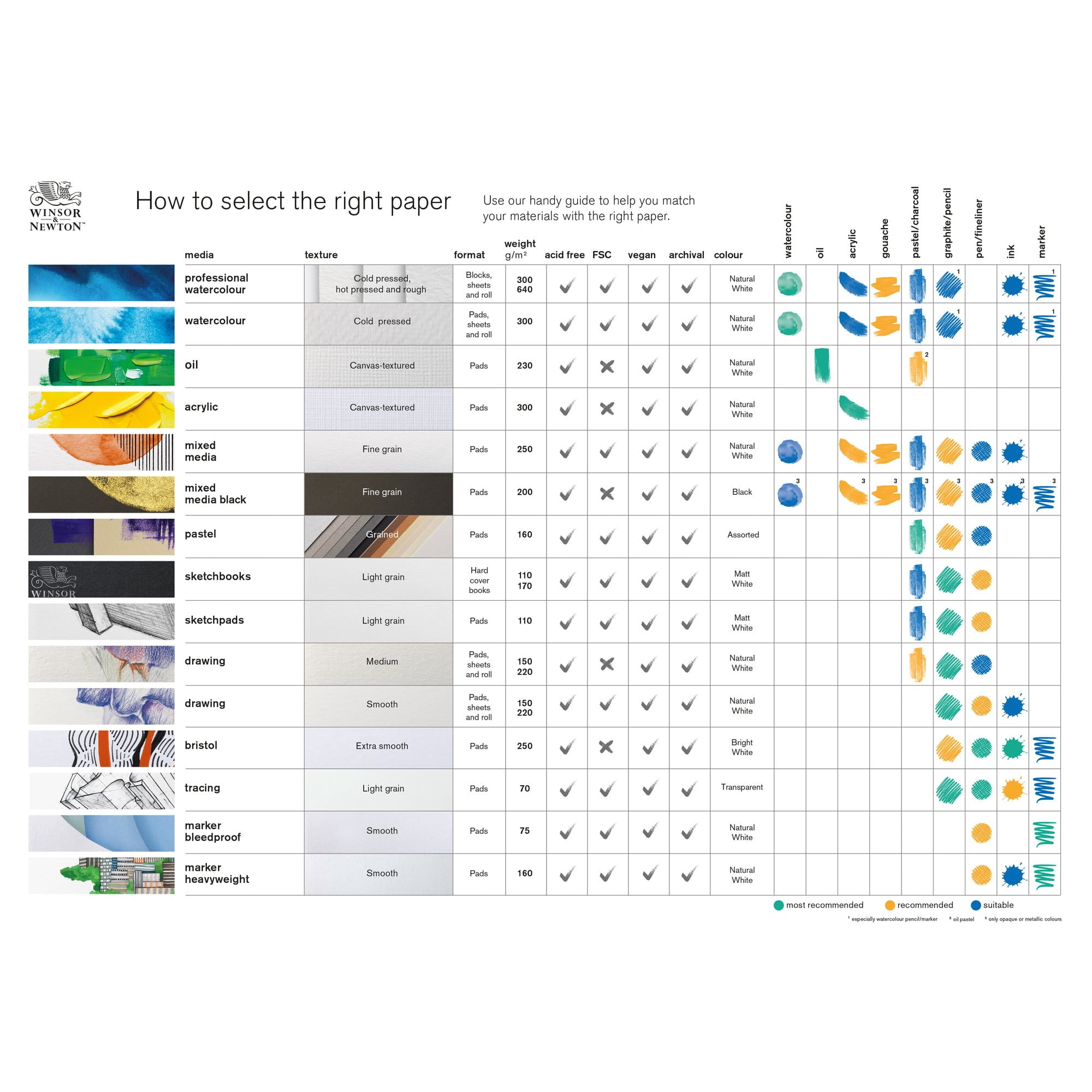 Blok Winsor & Newton to wysokiej jakości blok rysunkowy tłoczony na gorąco. Papier jest prawie całkiem gładki, co sprawia, że jest często używany do wykonywania detali i precyzyjnych prac. Cechuje się wysoką chłonnością. Dzięki wysokiemu poziomowi odbijania światła zapewnia doskonałe odwzorowanie kolorów farb. Sprawia wrażenie ręcznie robionego dzięki uformowaniu w tradycyjnej cylindrycznej formie.