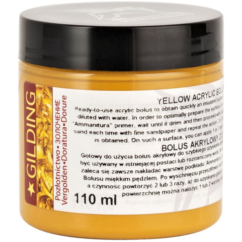 Gotowy do użycia bolus akrylowy, pozwala szybko uzyskać zaizolowaną powierzchnię do złoceń. Może być stosowany w istniejącej postaci lub w zależności od potrzeb rozrzedzany wodą. W celu optymalnego przygotowania podłoża przed nałożeniem bolusa zaleca się użycie podkładu Ammanitura. Po wyschnięciu powierzchnię przeszlifować każdorazowo drobnym papierem ściernym, nałożyć 2 do 3 warstw miękkim pędzlem. Po uzyskaniu gładkiej i wypolerowanej powierzchni można przystąpić do klejenia płatków złota przy pomocy mikstionu.