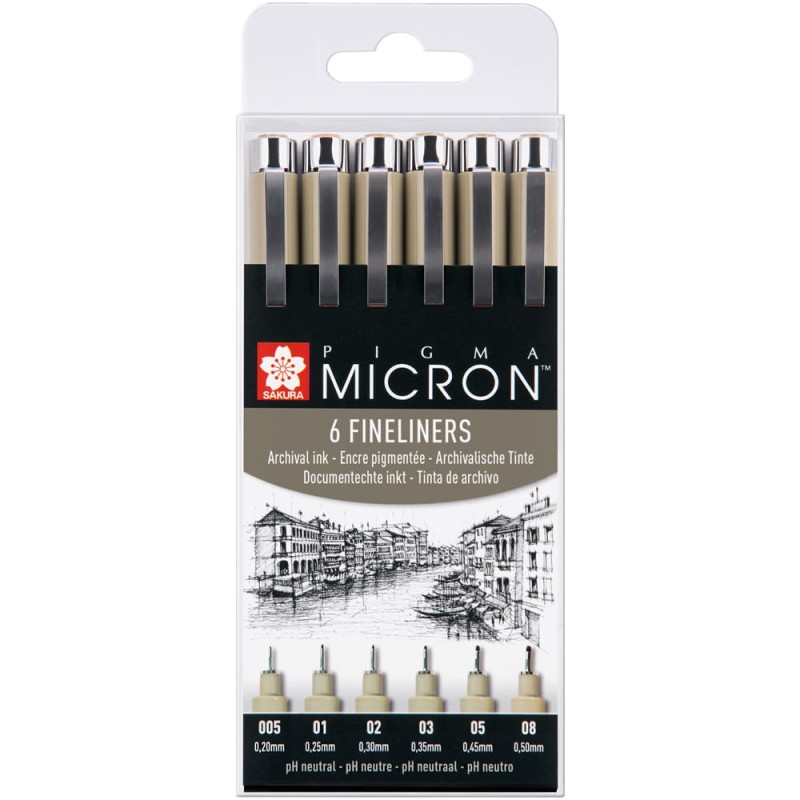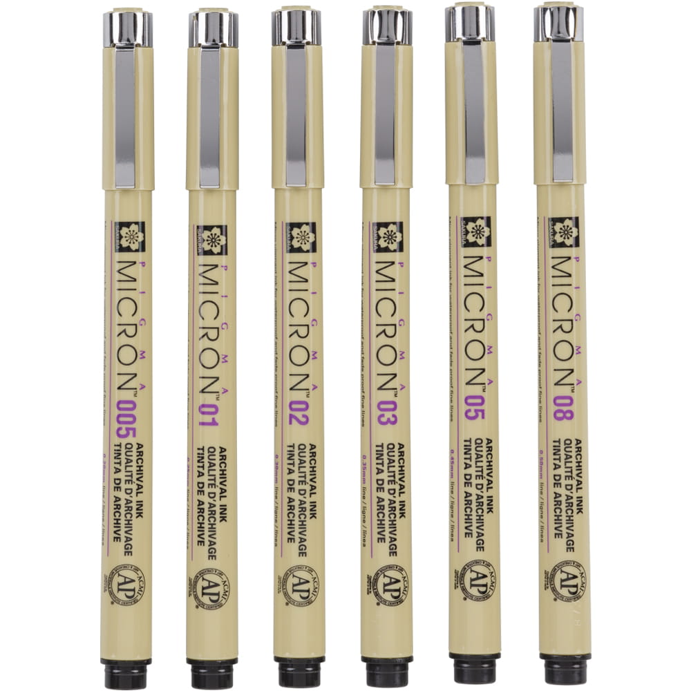 Cienkopisy Pigma Micron to niedrogie narzędzie pracy o wysokiej jakości. Posiadają one dziesięć dostępnych rozmiarów końcówek, pozwalających na kreślenie precyzyjnych linii. Bardzo trwały pigmentowy tusz przetrwa lata, a dodatkowo jest wodoodporny i szybko wysycha.