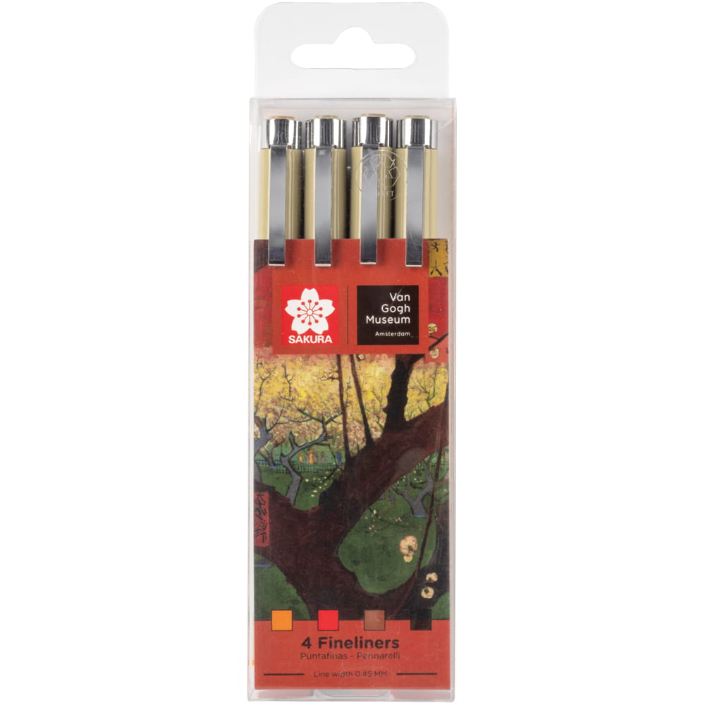 Zestaw Pigma Micron Fineliners od firmy Sakura zawiera 4 cienkopisy o grubości 05 - 0,45 mm w dopasowanych do siebie kolorach, nawiązujących do dzieła Van Gogh'a Kwitnąca śliwa. Zestaw powstał w kooperacji Royal Talens i Van Gogh Museum, jest inspirowany paletą kolorów dzieła mistrza.