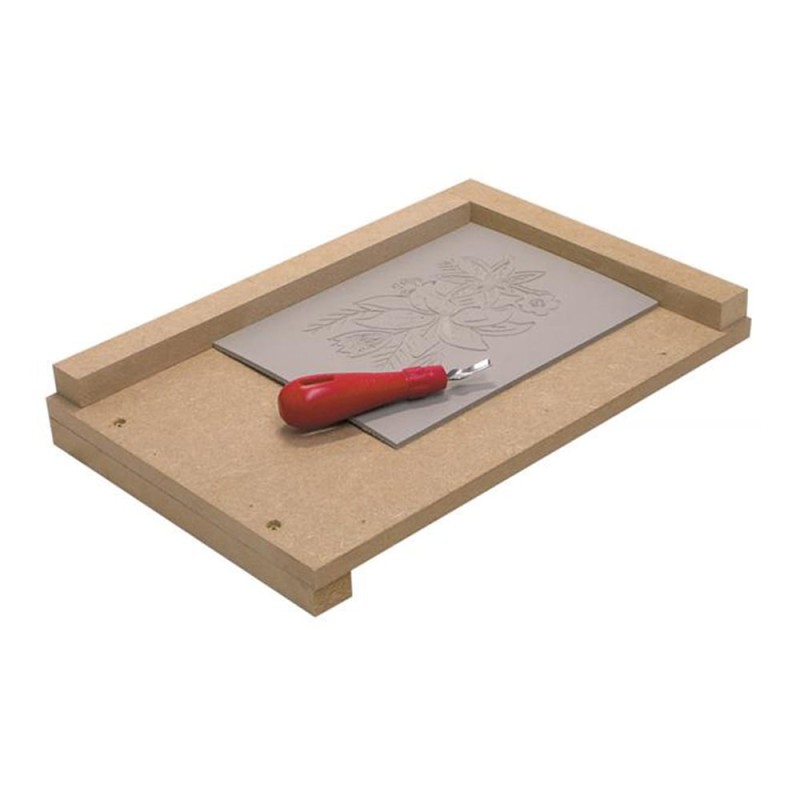 Deska pod linoleum marki Essdee wykonana z płyty wiórowej. Służy jako stabilizator podczas prac linorytniczych. Dwie górne poprzeczki przytrzymują linoleum w stabilnym położeniu. Dolna poprzeczka przytrzymuje stolnice przy stole.