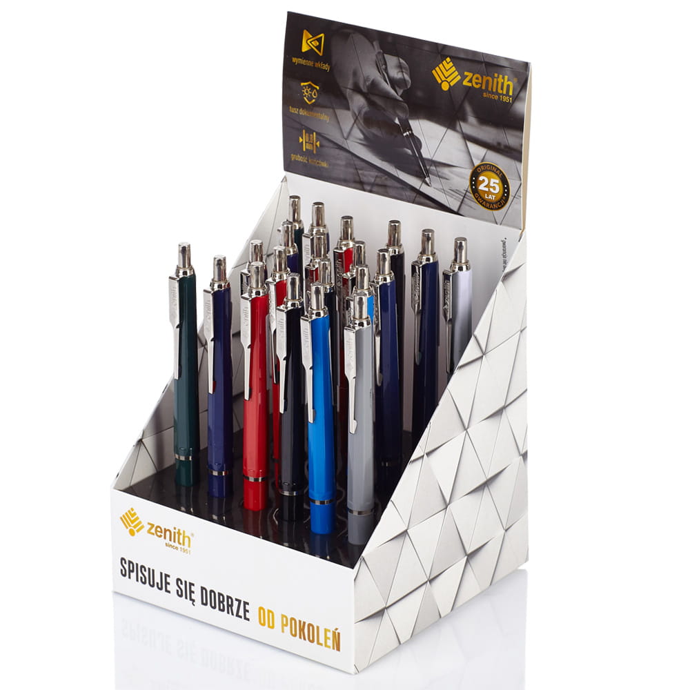 Długopis automatyczny Zenith posiada korpus wykonany z delikatnie błyszczącego tworzywa sztucznego, które wykończono niklowanymi elementami. Obudowę dzieli w 1/3 wysokości na dwie części mosiężno-niklowana obrączka. Dolny element jest okrągły, górny natomiast ośmiokątny. Długopis zawiera niezwykle pojemny wkład Zenith 4 z niebieskim tuszem dokumentalnym, który jest gwarancją trwałego, odpornego na światło i czynniki chemiczne zapisu. Kulkę wkładu wykonano z węglika wolframu.